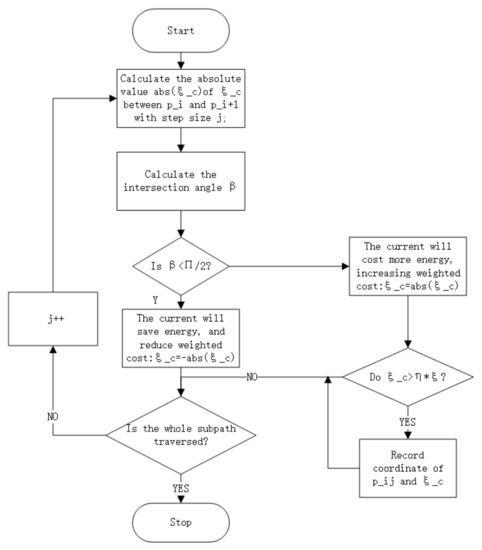 As currents have different directions, their effects on the HAUV’s path can be positive and negative. We firstly calculate the absolute value of current fields per meter of movement. Then its influence (positive or negative) is calculated in regard to the intersection angle between the current vector and subpath vector. Each subpath between and will be traversed by step : . We use indicator to evaluate the current field. Once is greater than , the weighted edge and coordinate are recorded as obstacles. The whole framework can be generalized as shown in Figure 9: