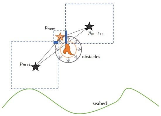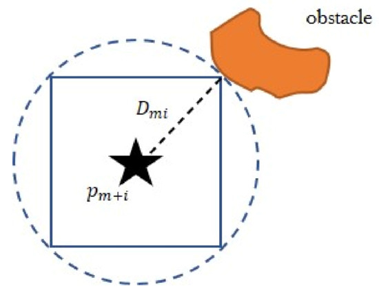 In practical operations, the HAUV is always subject to finite sensing resources; it cannot monitor the whole path at one time. Therefore, in this work whole path is divided into several subpaths. In the path P, each subpath contains more than 5 and less than 10 spots. Within the duration of , randomly shaped obstacles can appear with a certain probability in path segment []. We regard each obstacle as scattered points, and use k-means to find the center of each obstacle. For obstacles whose distances to the are less than the length of the HAUV, collisions happen. All the obstacles can be written as . For the obstacle in , all points on are . During the path segment from to , if obstacle exists, let the farthest distance from be the radius. Then draw a circle , such that is free of obstacles. Then, extend to , whose radius is denoted as . Therefore, the space in will be collision-free for the HAUV. The method in a two dimensional environment is as shown in Figure 5. Extended to three dimensions, the strategy also works.