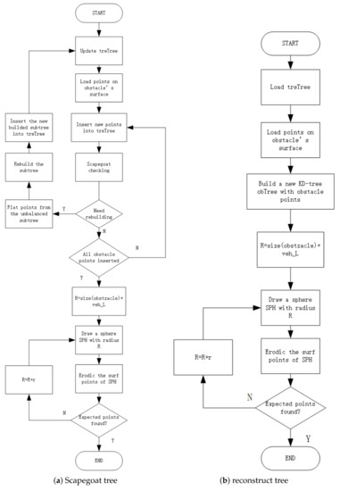 Based on space-partitioning, the KD tree is a data structure that is able to organize points in k-dimensional space. Since the KD tree is balanced, inserting points into it may lead to very deep sorting. However, reconstruction is unnecessary and increases the time cost for the whole algorithm. We solve this problem using the scapegoat tree. The scapegoat tree uses reconstruction criterion to ensure the balance of a tree. When a new point is inserted into a tree, trials are conducted to check if any sub-tree contains too many nodes in one side. Our approach to record unknown obstacles is demonstrated in Algorithm 2. We get a flat node from the sub-tree by orderly traversal.
