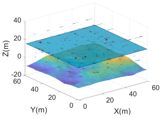 where denotes the lift force when the HAUV is in the static environment or current field, and defines the velocity of the HAUV in , which is expressed in m/s. is the air density, affected by altitude. is the reference area or the wing area of an aircraft measured in square meters, and is the coefficient of lift, depending on the angle of attack and the type of airfoil. We roughly set as 1 and as . When there are no current fields, is the average velocity during the HAUV mission. When currents exists, , where refers to the currents velocity. The size of our HAUV’s wing area on each side is 750 mm * 300 mm; therefore, the can be roughly set to 0.1–0.225 according to the direction of currents.
