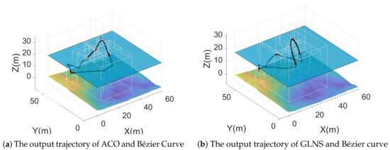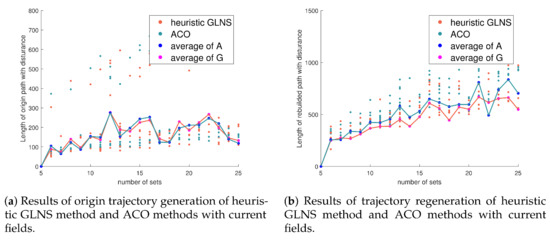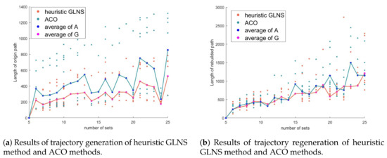 The original trajectory drawn by heuristic was better than ACO 88 times out of 100 runs. The average weighted cost of the former was 279.4952, and that of the latter was 432.5474. However, when it comes to the regeneration, heuristic performed better 72 times out of 100 runs, especially when the number of sets was enormous. The average weighted cost of the heuristic GLNS’s regenerated trajectory was 585.8950, and that of ACO’s trajectory was 674.8518.