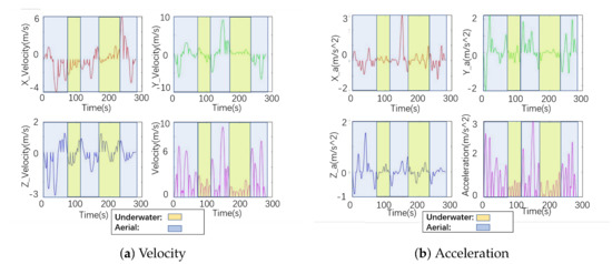 As the HAUV has different motion capabilities in diverse mission environments, different dynamic constraints should be set. Considering the experimental data of our former work, NEZHA, in this paper, we roughly define the motion capabilities of the HAUV as follows: The aerial velocity of the HAUV can range from 0 to 10 m/s, and it can range from 0 to 3 m/s under the water. The acceleration can vary from 0 to aerially, and from 0 to underwater. In addition, the HUAV can leave the water with a velocity no higher than 1 m/s and acceleration no greater than . Within a fixed period, the HAUV will move from to . The trajectory should conform to motion and space constraints.