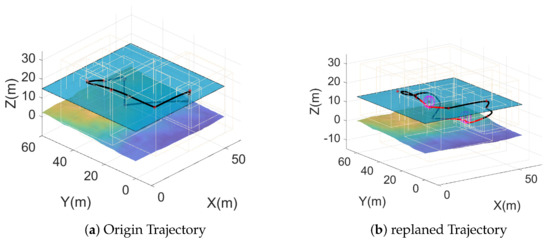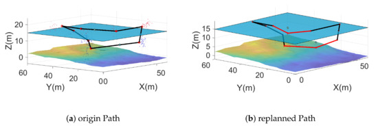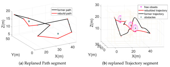 Compared to the former path, the new path should avoid obstacles. Trajectory generation methods also provide smooth, safe outputs. Figure 18 gives an example of a replanning path. The replanned path segment is marked in red: