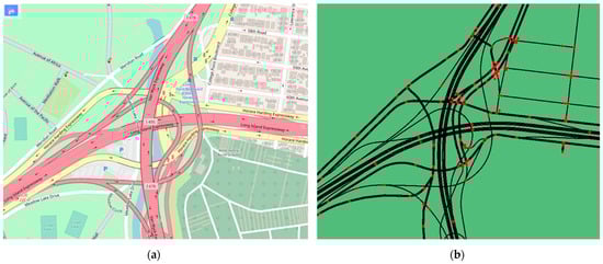 Example of converting a map in OpenStreetMap. (a) Original map view of OpenStreetMap. (b) Network imported into SUMO.
