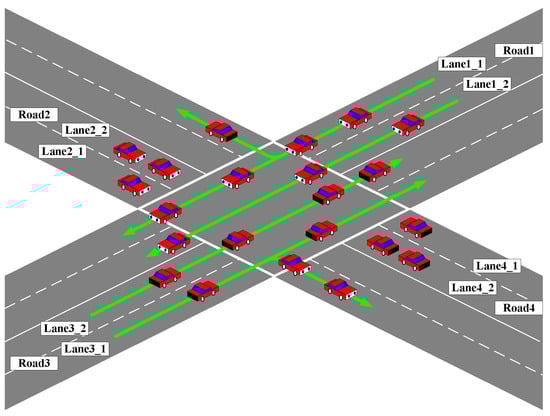 Developing strategies to control or reduce vehicular traffic problems mainly involves solutions in two areas: infrastructure reconstruction and city topology optimisation. But in many cases, this is infeasible and always expensive. Hence, researchers have proposed other strategies to deal with these problems. One of these is traffic signal control. It is possible to divide the exiting traffic signal systems into two subgroups: fixed-cycle or adaptive signal control systems []. To a significant extent, the inefficiency of today’s traffic signal systems, which primarily use fixed-cycle signal control systems, leads to traffic congestion. All control parameters in the fixed-cycle signal control system, including cycle length, phase duration, and sequence, are preset offline according to historical traffic flow information, regardless of the number of vehicles. Although it has an excellent performance in traffic regimes with constant traffic flow or small fluctuations [], the adaptability of this control method to traffic fluctuations is limited. Thus, it is impossible to treat with sudden changes in traffic flow []. Fixed-cycle methods’ major disadvantage is open-loop control since they can not adapt to real-time traffic fluctuations. And when the traffic condition changes, fixed-cycle approaches may aggravate the congestion. Therefore, the fixed-cycle signal control system is highly sub-optimal and needs to be replaced by better closed-loop methods.