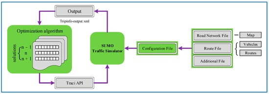 The simulation and three algorithms were applied on Python platform. SUMO traffic simulator was used in the Windows operation system for simulation. The simulation was performed using an Inter (R) Core (T.M.) i7-9750H CPU @ 2.6 GHz processor and 16.00 GB RAM. The Traci API of SUMO was used to retrieve simulated objects’ values and manipulate their behaviours instantly via the programmed optimisation algorithms. The process will ultimately achieve the satisficing of the real-time traffic signal control as designed. The theory of simulation using the SUMO traffic simulator is shown in Figure 3.