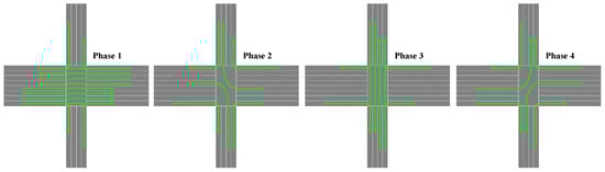 The simulation was conducted based on the simulated traffic environment from a crowded intersection in Dalian city in China. Four ways are gathered to the intersection whose information is shown in Table 1. The managed 4-phase authority is shown in Figure 4.