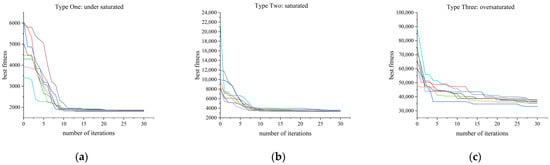 Besides traditional algorithms, some new optimisation algorithms are also applied in traffic signal control problems successfully. Celtek et al. [] used social learning-particle swarm optimisation (SL-PSO) to optimise the traffic control problem in Kilis city of Turkey. In the cases of different particles and iterations, the performance of SL-PSO was tested compared to PSO. The improvement in average travel time had proven the success of SL-PSO for traffic control problems. In [], the micro artificial system (MAIS) was developed to reduce pollution rates for a specific region of Mexico City by optimising vehicular flow. After the optimisation process, the vehicle’s waiting time was decreased and the speed was increased, leading to a decrease in fuel consumption and environmental pollution. Besides, the reason for the improved performance of the MAIS was analysed. Refs. [,] applied new meta-heuristic algorithms to the traffic control problem and achieved significant results. And this is the first of SL-PSO and MAIS to be used as a traffic signal optimiser.