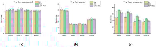 The following conclusions can be drawn: Firstly, our optimisation strategy shows a successful performance in the isolated intersection with hundreds of vehicles. Our method, which practically converged after the first 10 iterations, performed a fast convergence for the three different conditions. And this suggests that the use of our proposal for real-time traffic signal control is advantageous. Secondly, the boxplot representation of distribution results shows that LDW-PSO obtained better medians and means compared to B.A. and standard PSO. Besides, histogram representation of distribution results shows that the error bars of phase durations obtained by standard PSO and LDW-PSO are consistently lower than those obtained by B.A. in most cases. It means that standard PSO and LDW-PSO have better convergences and stabilities compared to B.A. Lastly, the phase duration obtained by LDW-PSO can reduce the queue length and average waiting time for the three conditions. Compared to B.A., LDW-PSO can remarkably reduce the queue length by 20.4% and the average waiting time by 17.9% regarding Type Three. And compared to standard PSO, LDW-PSO also achieves better results in three conditions. It means LDW-PSO has a stronger ability to deal with all these scenarios, especially complex situations with more vehicles.