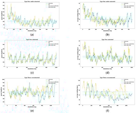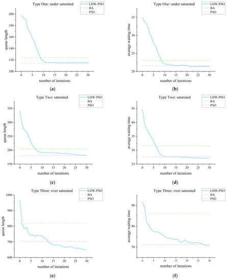 Three conditions’ best optimisation process of queue length and average waiting time. Their mean values are represented with dotted lines. (a) Type One’s best optimisation process of queue length; (b) Type One’s best optimisation process of average waiting time; (c) Type Two’s best optimisation process of queue length; (d) Type Two’s best optimisation process of average waiting time; (e) Type Three’s best optimisation process of queue length; (f) Type Three’s best optimisation process of average waiting time.