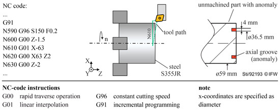 A series of experiments were conducted to examine the new method. Experiments comprised face turning operations under five different process conditions (Table 1). NC-code defined the face turning operation with constant cutting speed during the operation (Figure 1). Coated hard metal indexable inserts of the ISO type CNMG 120,408 were used. Tools were sharp with flank wear <100 µm. The workpieces had a length of 110 mm, a diameter of 59 mm and were from mild steel type S355JR (DIN EN10025-2, equivalent to ASTM A 573 M Grade 70). To simulate a process anomaly, an axial groove was machined in the face of the workpiece before the actual face turning operation (Figure 1, right). The groove caused a short drop in the cutting force in a manner partly resembling the behavior occurring when a cutting edge breaks [15].