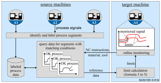 Figure 2 depicts the research method. A process on the target machine was monitored segment by segment. The approach was separated into offline and online stages. First, NC-instructions were analyzed offline to identify upcoming segments. The source machines provided OK-references that matched the identified segment, material and tool of the target machine. Then, statistical monitoring limits were calculated from the references, as established for series production (Section 2.2.4). The monitoring stage operated online to allow reaction times within the requirements of real time applications. For this, the monitoring procedure compared the actual process signal of the target machine to the calculated monitoring limits (Figure 2). A violation of a monitoring limit triggered an alarm.