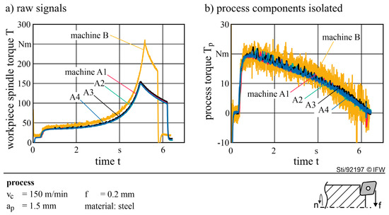 The compensation of inertia effects was based on the empirically determined inertia and spindle acceleration. Figure 3b depicts the process component Tp isolated from the workpiece spindle torque. The isolation had limited usability at the beginning of the segment, where boundary effects impaired the accuracy of isolation. Another inaccuracy was the drop in the process component of machine B at about 5.7 s.