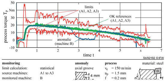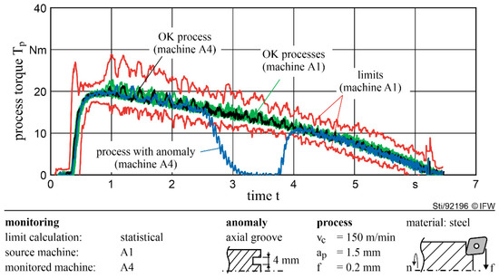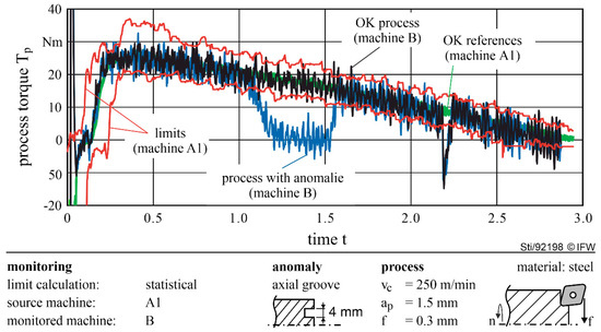 Additionally, the employed process force isolation caused false alarms at about 0 s to 0.25 s and at about 2.2 s, where it falsely created a signal valley for machine B. A more precise process component isolation would consequently increase the transferability of monitoring limits. In addition, a more sophisticated process component isolation might compensate disturbances in process signals that arise from the dynamic characteristics of a machine.