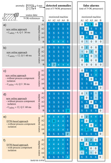 When comparing the proposed method (Figure 6a,b) to the DTW-based reference method (Figure 6f), the proposed method yielded higher detection rates (93% versus 83%) and fewer false alarms (35% versus 69%). Both methods benefited from the isolation of process components, in that false alarm rates decreased. Process component isolation enabled the proposed method to source monitoring limits from machine B with only one false alarm occurring on the monitored machines A1–4 (Figure 6a). However, monitoring of machine B resulted in the maximum number of false alarms possible. This asymmetry was not observed for the DTW-based reference method, as machine B remained unsuited as a source or as a target due to false alarms occurring in all of the evaluated scenarios.