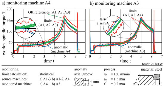 Transfer of monitoring limits among machines of the same model and without process component isolation. (a) Anomaly detected and no false alarms with machine A4 as a target. (b) Anomaly detected, but several false alarms with machine A3 as a monitoring target.