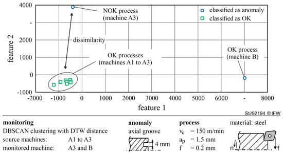 With the DTW-based reference method, no monitoring was possible (transfer A1–3 to B), despite isolating process components. While the approach detected the NOK-process, it also classified the OK-processes on the target machine falsely as anomalies. Figure 10 shows the classification results and visualizes the dissimilarity of the process segments as quantified with DTW and mapped via multidimensional scaling. The OK-processes of the source machines were grouped in a cluster. A NOK-process of a source machine, as a reference, was detected as an anomaly due to its distance from the OK-cluster. The OK-process of the target machine had a greater distance from the OK-cluster than the NOK-process of a source machine. Consequently, it was falsely classified as an anomaly. The NOK-process of the target machine was omitted from Figure 10 as its high distance from the OK-cluster diminished readability of the figure.