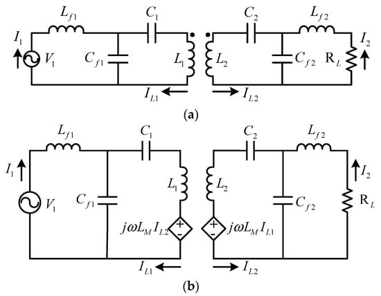 A wireless power transfer (WPT) system is a resonant circuit consisting of transmitting and receiving coils and a compensation circuit. The compensation circuit determines the system performance, so its topology and parameter design have become the most important part of WPT systems. Regarding the wireless power transfer, many approaches are referenced and studied, such as magnetic flux induction, two-coil loosely coupled transformer, microwaves, and lasers [,]. Herein, the two-coil loosely coupled transformer, which can transfer power wirelessly with high efficiency across large air gaps, is of note. Four basic topologies are often referenced. Depending on how the compensation capacitors are added to the transmitting and receiving coils, they are simply named as series–series (SS), series–parallel (SP), parallel–series (PS), and parallel–parallel (PP) topologies [,]. Compared with the conventional topologies, the double-sided LCC compensation network is shown in Figure 1. It works as a current source to both the input and output [,,,,], which is suitable for light and heavy load conditions. Even when no load is placed in the load side, this topology can maintain suitable power distributions. This feature is very suitable for dynamic WPT because misalignment will commonly appear during the dynamic charging. The compensation capacitor is determined by the self-inductance, so coil misalignment does not significantly affect the resonance. Moreover, the circuit can realize unity power factor at the input, so there is no reactive power in the system. Furthermore, the circuit can be designed to provide zero-voltage-switching (ZVS) for the input inverter and eliminate the reverse recovery loss in the rectifier, so the system efficiency can reach 96%. Also, two of the inductors can be designed as planar inductors, integrated with the main coils to save space [,]. As illustrated in Figure 1a, this topology consists of one inductor and two capacitors at both the primary and secondary sides. Note that in Figure 1a, the double-sided LCC compensation topology was applied in the WPT unit of this paper. Its applications are highly suitable for both dynamic and static WPT of electric vehicles [,]. Additionally, due to the coils, the system can be placed under the chassis. Such structure of WPT is also easy to integrate into autonomous vehicles [,]. Eight parameters in the LCC circuit model are applied in the wireless charging system. These factors affect the system performance such as power, efficiency, and safety []. Basically, temperature, DC bias, and stochastic process may affect the parameter drift significantly. In practice, these drift affections will deteriorate the output performance of the vehicle systems. Clearly, parameter drift problems in static WPT and misalignment issues in dynamic WPT reveal similar effects to unsteady output, which are both important issues that could be investigated.