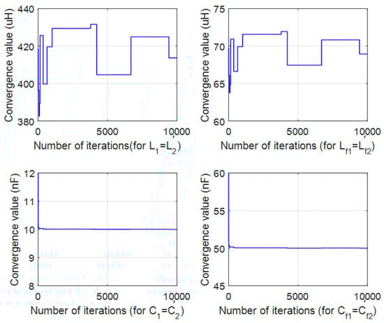 Under Hypothesis 1 and , , , for the sake of simplifying a simulation, we set , , and , , , , , and for each to guarantee that Hypothesis 1 holds. Additionally, we take and an initial state . Then, proceed the estimation algorithm as mentioned in Section 4.3. For from 1 to 10,000, the synthesized values were revealed in Figure 2. In Figure 2, all tests are done by 10,000 iterations. As can be seen in this figure, the sample path is reasonably well converged, which satisfies the conditions that an asymptotic stable circuit should have. Under the condition of Hypothesis 1, the convergent value of capacitance reaches its steady state quickly. However, the inductance has a slower convergent rate. The convergent speed of steady value is different between inductor and capacitor because of the dynamical behavior of LCC topology. Note that only static WPT fits this conclusion.