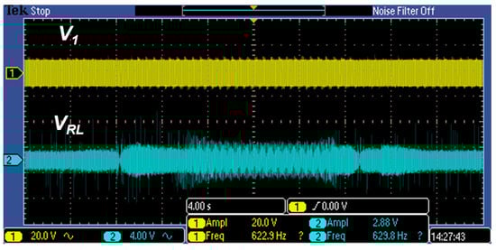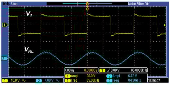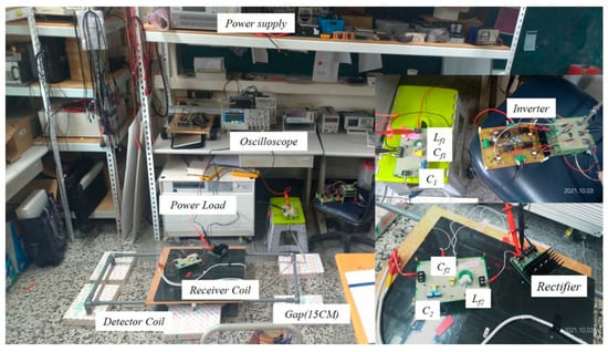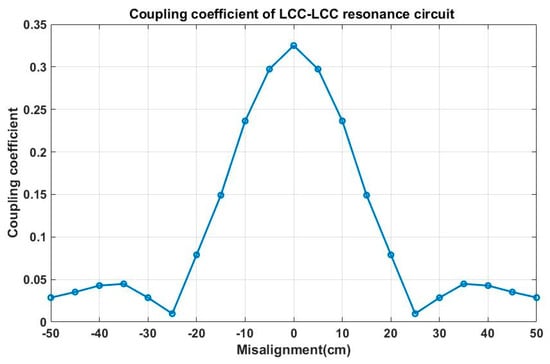 Misalignment in static WPT can be applied to simulate the approaching or leaving statuses (or both) of dynamic WPT. In dynamic WPT, parameter drift affects the transmission power and efficiency, respectively. Basically, the whole process of “approaching–central–leaving” of the dynamic WPT can be treated as a series of parameter varying, which can be modeled by stochastic process. Hence, using the stochastic model to probe the system performance is an appropriate solution. Via simulation, engineers can use the stochastic model to preview the system performance before the activation of dynamic WPT process. For further demonstrating the LCC-compensated performance in dynamic charging, a small scale of experiment was employed to show its feasibility. The verification experiments are carried out on the test bench, as shown in Figure 3. Table 1 illustrates the relevant specifications of test bench. Its rated DC voltage is 10V, which is a small scale of WPT for demonstration. Figure 4 is the measurement data for coupling coefficient. Figure 5 shows the resonant conditions. Clearly, the resonant frequency exactly falls on 85 kHz, which satisfies the requirement from WPT. To test the affections of misalignment, as shown in Figure 6, a scenario of dynamic movement of receiving coils are scheduled. The experimental result is revealed in Figure 7. Clearly, the received energy is sensitive to the misalignment, which is relevant to the coupling coefficient, as shown in Figure 4.