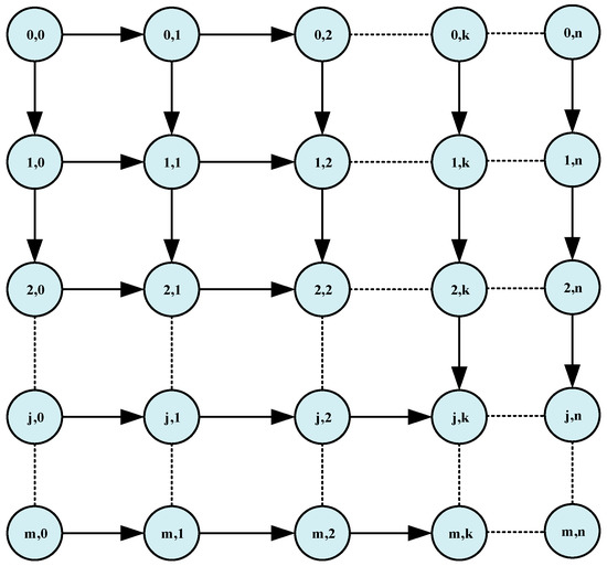 To obtain the optimal merging sequence for one group of clustered vehicles, we modeled the ramp merging as a directed graph shortest path problem to minimize the total fuel consumption while improving traffic efficiency. We construct a directed graph as shown in Figure 3, where and denote vertex and edge set, respectively. As a node of the graph, means that vehicles on the main road and vehicles on the ramp road have the right to go through the merging point. Since overtaking is not allowed on a single-lane road, vehicles on each road obtain the right in an order closer to the merging point.