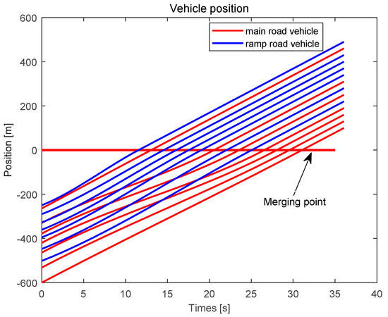 The trajectories of the vehicles met the minimum fuel consumption, and the analytical solution was Equation (15). The trajectories of all vehicles are shown in Figure 5. In Figure 5, the red curves are the trajectories of the vehicles on the main road and the blue curves are the trajectories of the vehicles on the ramp. The curves of the same color are not staggered, indicating that the vehicle did not collide. The vehicles formed a vehicle platoon with the constant distance of and the speed of after passing the merging point. The speed and acceleration of the vehicles are shown in Figure 6a,b, respectively.