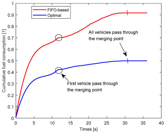 Then, we verified the effect of this method in reducing accumulative fuel consumption. The optimal method was compared with the FIFO-based method. The result is shown in Figure 7. The optimal method decreased accumulative fuel consumption by 45.57% based on the FIFO-based method. It can be seen that the accumulated fuel consumption increases with time quickly at the beginning. The main factor was the large acceleration of the leading vehicle. The leading vehicle in this group of vehicles arrived at the merging point as quickly as possible, which shortened the time for this group of vehicles merging at the highway on-ramp.