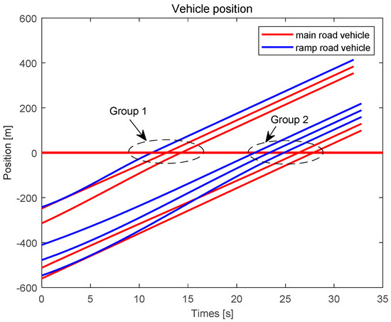 The trajectories of the vehicles in two groups are shown in Figure 8. In Figure 8, the vehicles in the detecting area formed two platoons after passing through the merging point. The speed and acceleration of the vehicles were shown in Figure 9a,b, respectively.
