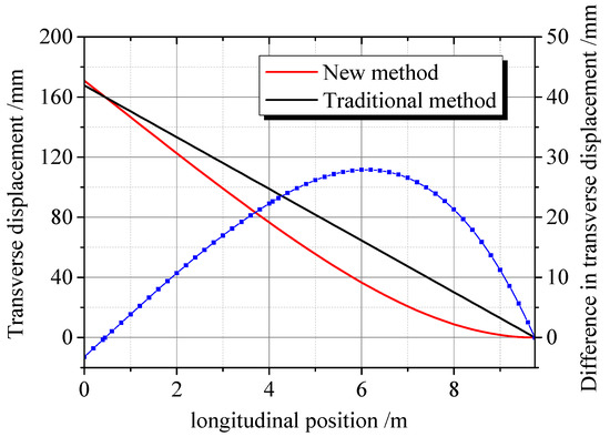 Figure 6. The transverse displacement of the switch rail under the separated state, obtained using the traditional method, is higher than that obtained using the proposed method; it is small only before the first traction point. The maximum deviation reaches 27.9 mm, which is large enough to jeopardize the accuracy of the design of the parameters related to rail switching. In addition, the actual minimum flangeway width after assembly is less than 65 mm of the width of the flangeway is set at 65 mm during the design because the transverse displacement of the switch rail under the separated state obtained using the traditional method is larger than that in the actual situation. This adversely affects the safety of trains passing the turnout. The proposed method determines the plane alignment under the separated state based on the actual force imposed on the switch rail, which is consistent with the actual situation and more dependable.