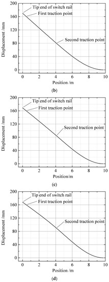 The design of the traction point stroke, besides minimizing the traction force at the first and second traction points, should reduce the working power of the switch device. In addition, the deformation of the switch rail should be coordinated to avoid uneven deformation. The additional numerical test conditions are set up as shown in