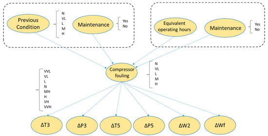 The parent nodes represent compressor condition and turbine condition in the two BNs. These were considered as a function of some deviation factors in component efficiency and flow capacity. The deviation factors were calculated as per Equations (11) and (12).