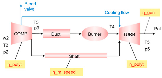 Schematic diagram of the gas turbine model (η_polyt: polytropic efficiency, η_m: shaft mechanical efficiency, η_gen: generator efficiency).