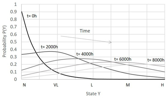 One way to improve the fault probability estimation is to consider that “older” machines are more likely to be in a degraded state than new machines. The prior probability for each state can be assigned as a function of the equivalent operating hours according to the history of the machine and the experience of the operators. In [26], a discrete Poisson distribution was used to assess the prior probability of failure rate. In this case, we are not interested in the failure rate as a function of the number of events, but we can nonetheless use the same function where the event number is replaced by the health state Yi (from 0 for N to 4 for H). The discrete distribution is described by Equation (15), where the coefficient λ is varied linearly with time, i.e., λ = dt + λ0, where d represents the degradation rate and λ0 the initial value for λ.