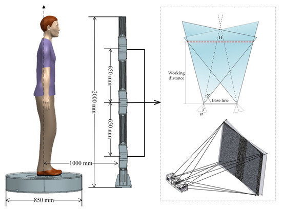 As shown in Figure 1, the designed scanning system consists of a multi-sensor column and a precision turntable, in which three infrared laser speckle projection-based binocular sensors are equidistantly distributed on the column. As an aggregate of the regions with available data (Europe, North America, Australia, and East Asia), statistics show that 95% of the sampled people born between 1980 and 1994 fall in the range from 1632 to 1936 mm [25]. In order to be able to scan more than 95% of people in China, taking the maximum height of 1950 mm as an example, according to the scanning scheme, three binocular sensors are distributed along the vertical direction, and the effective measurement height of a single sensor should reach 6500 mm. In order to achieve large scanning scenes at a possible short working distance, industrial cameras with large target size and short focal length industrial cameras are preferred on the premise of meeting the scanning precision. Therefore, half-inch cameras with half-inch target size and lens with 8 mm focal length are used in the stereo sensor. Based on field of view coincidence constraint, the designed effective measurement field of view of the stereo sensor is 680 mm × 544 mm at a working distance of 880 mm. Three binocular sensors are vertically fixed on the upright column with equal interval of 650 mm, and the height of the upright column is 2000 mm. The distance between the axle of turntable and upright post is 1000 mm, and the whole system covers an area less than 2 m2.