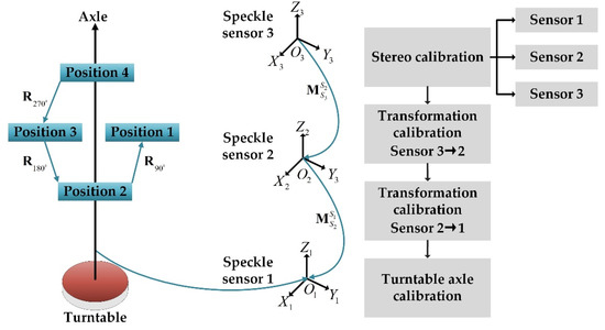 There are four scanning positions in a scanning period, and the rotating angle of the turntable is 90° between every two positions. The starting position of the turntable is set as the first scanning position, and the rotating angles of 90°, 180°, and 270° are the second, third, and fourth scanning positions, respectively. As shown in Figure 2, the three stereo speckle sensors on the column are numbered 1, 2 and 3 from bottom to top, corresponding to the three measurement coordinate systems, namely , , and , respectively, where the coordinate system of speckle sensor 1 is taken as the global coordinate system of the scanning system.