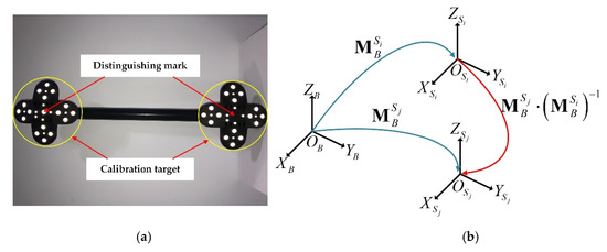 As shown in the right part of Figure 2, system calibration includes three parts. First, stereo calibration is required for each speckle sensor. Then, the pose transformation between each two sensors needs to be calibrated. Finally, the mathematical expression of the turntable axle in the coordinate system of sensor 1 needs to be calibrated. The field of view of the designed speckle sensor is 680 mm × 544 mm, a 70-inch LCD screen (LCD-70SU685A) is used to display the circular spot array image designed according to the resolution of the display in full screen, and the pixel size of the displayed image can be calculated from the physical size of the display. Then, Zhang’s plane calibration algorithm [26] is adopted for stereo calibration. Next, it is necessary to calibrate the pose transformation matrix between the two adjacent sensors because the overlapping field of view between the two adjacent sensors is very small, which cannot be directly used for pose calibration. A portable hand-held calibration rod is designed, two calibration target blocks are connected with a rigid rod to indirectly establish the common field of view between the two adjacent sensors. As shown in Figure 3a, there is a target block at each end of the designed calibration rod. The length of the connecting rod is the same as the space distance between the two sensors. During the calibration process, the target blocks at both ends should be in the respective fields of view of the two sensors. The two target blocks are composed of two kinds of circular markers with different diameters, marker identification method can refer to our previous work [13]. It should be noted that the only difference between the two target blocks is whether there is a large circular marker in the center, so the two target blocks can be automatically distinguished during calibration. As shown in Figure 3b, the calibration target coordinate system needs to be created, CREAFORM C-Track™ | Elite binocular tracking equipment is used to obtain the 3D physical coordinates of each circular marker. and are the coordinate systems of the two adjacent sensors, the posture transformation matrixes from the calibration target coordinate system to the two sensor coordinate systems are denoted as and . During the process of pose calibration, the 3D coordinates of circular markers on each target block are measured by the speckle sensor, and then and can be calculated according to the corresponding relationship between the measured points in the sensor coordinate and physical points in the target coordinate system. Therefore, the pose transformation matrixes from to is . In order to improve the calibration accuracy, the attitude of the target bar is adjusted several times under the precondition that the field of view allows to collect unambiguous images. The physical distance between multiple target points on the target block and different target points on another target block is used to establish the optimization error function, which is then optimized by the Levenberg–Marquardt algorithm [27] to obtain optimal pose transformation matrix.