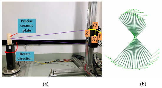 Finally, it is necessary to calibrate the position of the rotating axle in the coordinate system of sensor 1. The plane rotation measurement calibration method proposed by Ye et al. [15] is adopted, the prerequisite of the method is that the calibration target plane is perpendicular to the plane where the turntable is located. Due to the high machining and assembly accuracy of the turntable, as shown in Figure 4a, a high-precision ceramic cuboid is vertically placed on the turntable, the target plane can be regarded as a vertical relationship with the turntable plane, and the turntable is controlled to rotate for multiple angles, at each angle, sensor 1 is used to measure the surface of the plane. To determine the rotation axis, we need to determine two factors: direction vector of rotation axis and turntable center position. To calculate the direction vector of rotation axis, the measured data of the precise ceramic plate at each position are fitted into the plane firstly, and then we can obtain multiple fitted planes as shown in Figure 4b. Secondly, compute the intersection of any two fitted planes, and then calculate the average of the normal vectors of all the intersection lines, which is regarded as the normal vector of the rotating axle. In order to solve the turntable center point, we have calculated the distance from any point on the rotating axle to each fitted plane, which should be constant. Therefore, the point on the axle can be solved by minimizing the of sum of the distance squares by the Levenberg–Marquardt algorithm [27]. Up to now, the whole measurement system calibration is finished.
