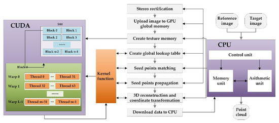 In order to shorten the calculation period, a serial-parallel computing strategy of speckle image matching using digital image correlation is introduced in this section. According to the CUDA programming specification, the serial-parallel computing strategy shown in Figure 5 is designed to improve the efficiency of data calculation. Firstly, the left (reference) and right (target) images captured by binocular sensors are rectified on the CPU, then the corresponding global memory is created on the GPU, and the rectified images are uploaded to the designated memory on the GPU. In CUDA, the texture memory has a faster reading and writing speed than the global memory, and the rectified image pair and corresponding gradient image need to be read frequently in the matching calculation process. Therefore, texture memory has the same memory size as the global memory created on the GPU, and the global memory is banded to the texture memory. Then, the CPU sends out calculation instructions, which are mapped to the GPU through kernel function to complete the calculation processes such as establishing related global lookup table, seed points matching, seed points propagation, 3D reconstruction, and coordinate transformation. Among the above processes, the kernel function can reasonably set the dimensions of grid and block according to the calculation requirements. The data are downloaded to the CPU when the calculations are finished, and one group of local point cloud calculation is completed. As mentioned above, local point cloud computing needs to be performed 12 times in the whole measurement period, that is, the above-mentioned serial-parallel process needs to be performed for 12 times during the scanning process.