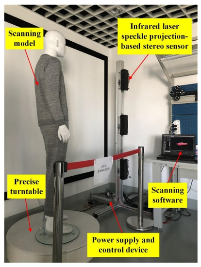 Human body scanning is an important means to build a digital three-dimensional model of the human body. Intelligent clothing production [1], medical plastic surgery [2], 3D printing and other fields have wide demands for non-contact human body scanning based on optical measurement technology [3,4,5,6]. Under the background of intelligent manufacturing, the industrialized tailoring of clothing is booming gradually and transforming to the goal of intelligence and individuation constantly. The clothing production mode is to design and make clothing according to the clothing style selected by users and their body size, which not only meets the requirements of users’ physical characteristics, but also meets their personalized needs. At present, in addition to the daily clothing sewed according to the uniform body standard, some clothing needs to be tailored, such as suits, military uniforms, service uniforms and so on. The traditional custom-made mode mainly relies on experienced masters to measure the parameters needed for garment making, such as shoulder width, waist circumference, and arm length, and then cut and sew according to the measured parameters. Take the customization of a high-class suit as an example, which goes through complicated and lengthy processes such as size measurement, white embryo making, white embryo fitting, fabric confirmation, and garment sewing [7]. In addition, the fit and comfort of clothes depends largely on the tailor’s personal experience. In order to solve the above problems, digital intelligent clothing customization technology based on garment parameter extraction [8] and white embryo production from the digital 3D model of the user comes into being. Therefore, the complete 3D human body scanning is the foundation of intelligent garment manufacturing. The point cloud of the human body can be obtained by 3D scanning, which can quickly and accurately obtain the parameters of several key parts of the garment. At the same time, it can also personalize the parts with special needs, such as abdomen and back, which can greatly improve the comfort and fit of clothing to customers.