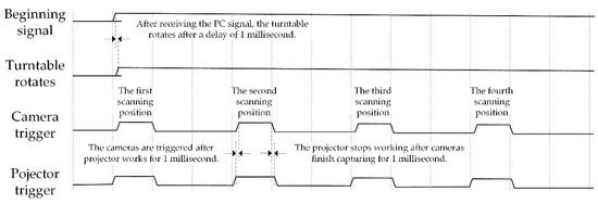 After power supply, the system only needs to wait to receive the beginning signal sent from a personal computer through a network cable, after that it can work automatically. The controlling sequence diagram is shown in Figure 7. The initial position of the turntable is the first scanning position. At this time, the triggering signal is sent to turn on the speckle projection module. Then six cameras in the three sensors perform synchronous hard trigger acquisitions after the three projectors work for 1 ms. When the cameras finish exposure for 1 ms, the acquisition end signal is sent to the control core panel, thus controlling the projection module to break the circuit. At this time, the first scanning process ends. When the turntable moves to the next scanning position, the above control procedure repeats. After the last scanning process finished, the control core board feeds back the ending signal to the PC. At this point, the serial-parallel computing programs are executed, and the turntable rotates back to the initial position.