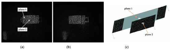 In order to evaluate the measurement precision of the designed stereo sensor, as shown in Figure 8, a ceramic step block with machining tolerance of ±0.05 mm is measured by the speckle stereo sensor. The captured stereo images are shown in Figure 8a,b. As Figure 8c shows, two standard planes marked in Figure 8a are fitted from the reconstructed point cloud. The fitting standard deviations of plane 1 and plane 2 are 0.137 mm and 0.097 mm, respectively. Then, nominal depth from plane 2 to plane 1 is 20 mm. Then, ten reconstructed points are randomly selected on plane 2, the distance from the selected point to plane 1 is calculated, which is regarded as the measured depth from plane 2 to plane 2. The statistics of depth measurement error are listed in Table 1, the minimum error, maximum error, mean error are 0.136 mm, 0.278 mm, and 0.191 mm, respectively. The above results show that the measurement precision of stereo sensor is higher than 0.3 mm.