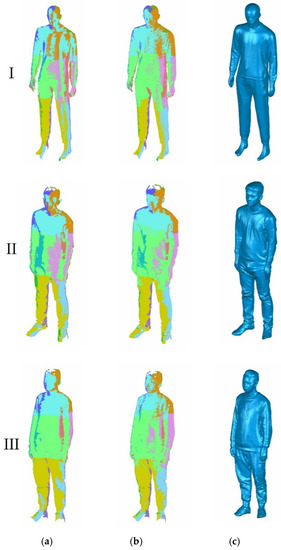Before conducting the scanning experiments, the system is calibrated by the calibration method described above, then the effectiveness of the proposed scanning system is verified by three groups of anthropometric model and real human body scanning experiments, the scanning results are shown in Figure 9. For the convenience of introduction, the three groups from top to bottom in Figure 9 are indexed as I, II, and III. Index I represents the scanning result of an anthropometric model, II and III represent the scanning results of two persons. Figure 9a shows the global point clouds coordinate registration of the local point clouds obtained from 12 local views, in which different colors are used to distinguish the local point clouds. In order to suppress the registration error, the global registration function in Geomagic Studio 2012 is used to optimize the registration, the results are shown in Figure 9b. The optimized point cloud after registration is triangulated into a mesh model using the “Wrap” function of Geomagic Studio 2012, and then the convex regions and the holes are removed and filled using the “Polygons” module. Figure 9c shows the modeling renderings after point cloud encapsulation and hole repair. In Figure 9, it can be seen that the proposed system can collect the human body almost completely except for a small part of data missing in the scanning blind area and local occlusion. The average distance deviations and standard deviations of the global point clouds optimized by the function global registration function in Geomagic Studio 2012 are listed in Table 2, in which the maximum value of the average distance deviation is 1.494 mm and the maximum value of the standard deviation is 1.130 mm. The results show that the comprehensive error of point cloud stitching is less than 1.5 mm, and the measurement precision of the speckle sensor is higher than 0.3 mm. Therefore, the comprehensive scanning error of the proposed system is less than 2 mm.