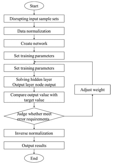 The BP neural network algorithm programming flowchart is shown in Figure 3. In order to reduce the influence of the input data sequence on the result, the input sample set needs to be randomly disrupted by using the “randperm” command in MATLAB.