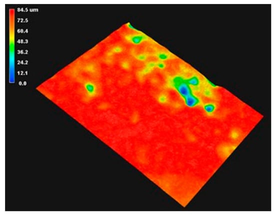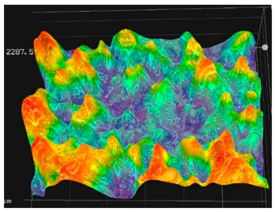Figure 5 shows the initial contour morphology of the #80 mesh belt. The uneven distribution of the abrasive grain height can be clearly seen, which further reflects the necessity of initial pre-wear. Figure 6 shows the surface contour of the belt near the end of the severe wear stage. According to the color of height spectrum, it can be seen that the overall height of the abrasive grains is reduced, and the surface height is almost the same. However, as the amount of wear increases, the contact area between the abrasive belt and the workpiece increases during the grinding process, which will generate a lot of heat. On the one hand, it will accelerate the abrasive belt wear, and on the other hand, it may burn the surface of the workpiece. Therefore, it is very critical to accurately predict the degree of abrasive belt wear.