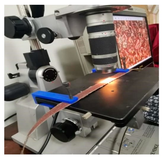 For the sanding belt within the interval length, researchers should fix the space position of the microscope lens and the position of the operating platform while framing. Meantime, the belt should be fixed by the self-designed special 3D printing fixture, as shown in Figure 9. The fixture is made of PLA material, which will avoid the damage of the microscope table due to touch and friction. By choosing this material, the repeatability of the measurement field will be maximized and the influence of random errors can be reduced, which will ensure the consistency and integrity of the measurement, as well as improve the data credibility.