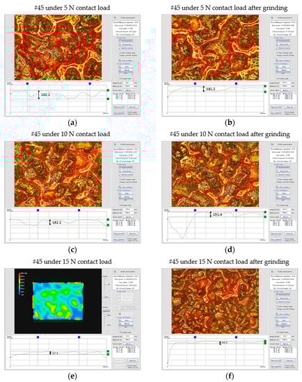 Figure 11e shows #45 under the contact load of 15 N, the initial belt contour interval takes the points NA1, NA2, and NA3. The measured heights are 84.6 μm, 81.1 μm, 97.3 μm, and the average value is 91.0 μm. According to the cloud chart chromatogram, it can be clearly seen that after a series of grinding processes in the early stage, the overall height of the abrasive particles has dropped a lot.