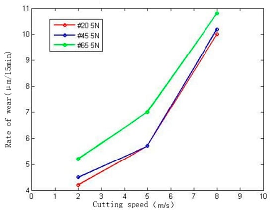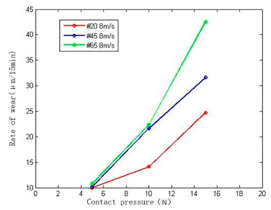 Figure 13 shows the change curve of wear rate with contact pressure for different materials at a grinding speed of 8 m/s. According to the figure, it can be seen that when the contact pressure of the abrasive belt is 5–15 N, the high wear rate of the abrasive belt has a huge increase with the increase of the pressure. The contact pressure increases by 10 N, and the wear amount increases by nearly 70%. As the contact pressure increases, the pressure on a single abrasive particle increases, the cutting depth also increases, and the temperature in the contact area increases faster, which ultimately leads to increased wear. At the same time, it can be seen that with the increase of contact pressure, the increase of the wear rate of materials with higher hardness is greater, so the difference of materials has a greater superimposition effect on the change of contact pressure.