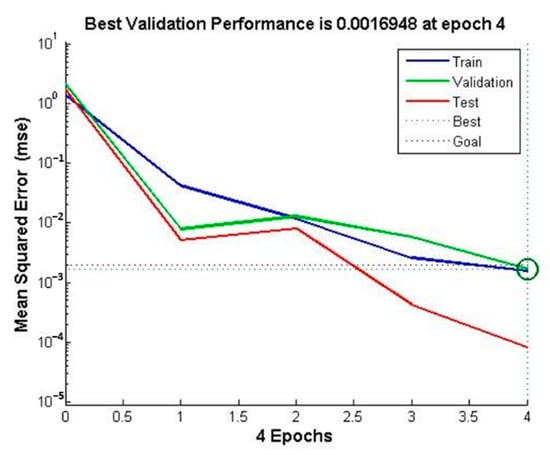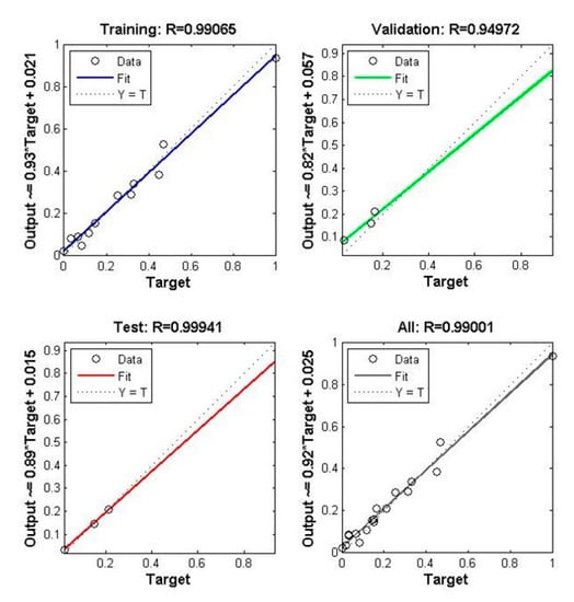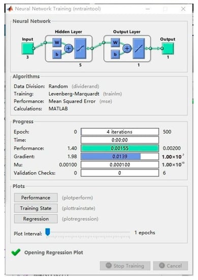 The number of iterations and the learning rate are determined by engineering experience. The number of iterations are usually 500–1000. The larger the learning rate, the greater the weight change and the faster the convergence. However, if the learning rate is too large, it will cause system oscillation []. In this paper, the number of iterations is set to 500 net, that is trainParam.epochs = 500, and the learning rate is set to 0.01, that is net.trainParam.lr = 0.01.