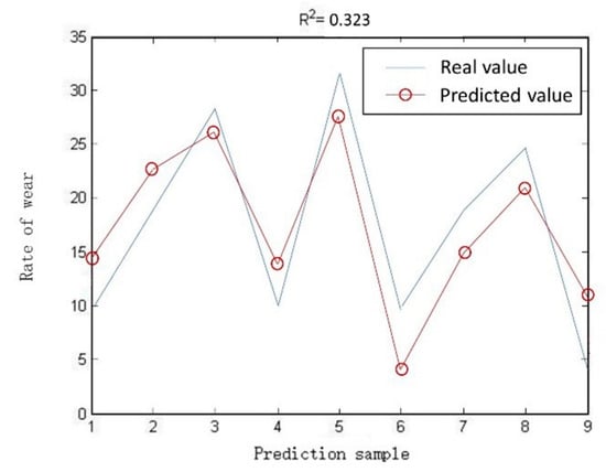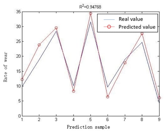 Among the 27 sets of data in Table 3, 18 sets of data were randomly selected by the program for algorithm training, and then the results of the remaining 9 sets of experiments were used for verification and comparison. The comparison of the true value and the predicted value of the 9 sets of verification results is shown in Figure 17 and Table 5. R2 reaches 0.94768, which shows that the prediction accuracy of abrasive belt wear is very high.