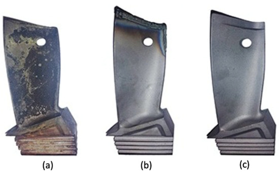 An example of worn turbomachine blade (a) as is (b,c) after restoration.